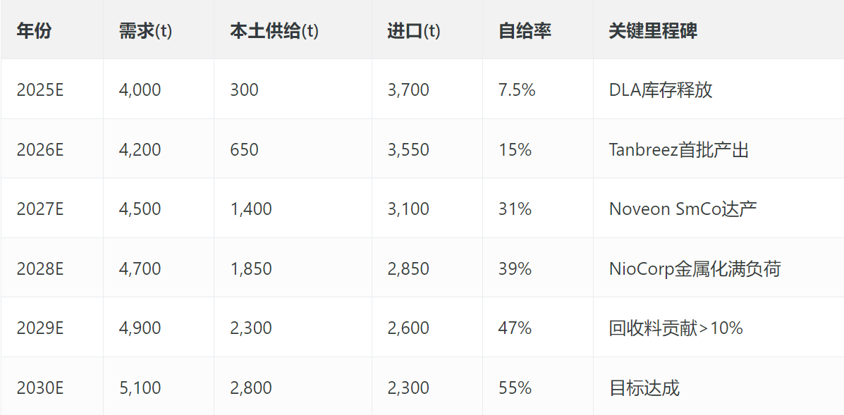 2025-2030年美军工HREE年均需求:Tb≈180t,Dy≈1,200t,Sm≈1,500t,Y≈900t。