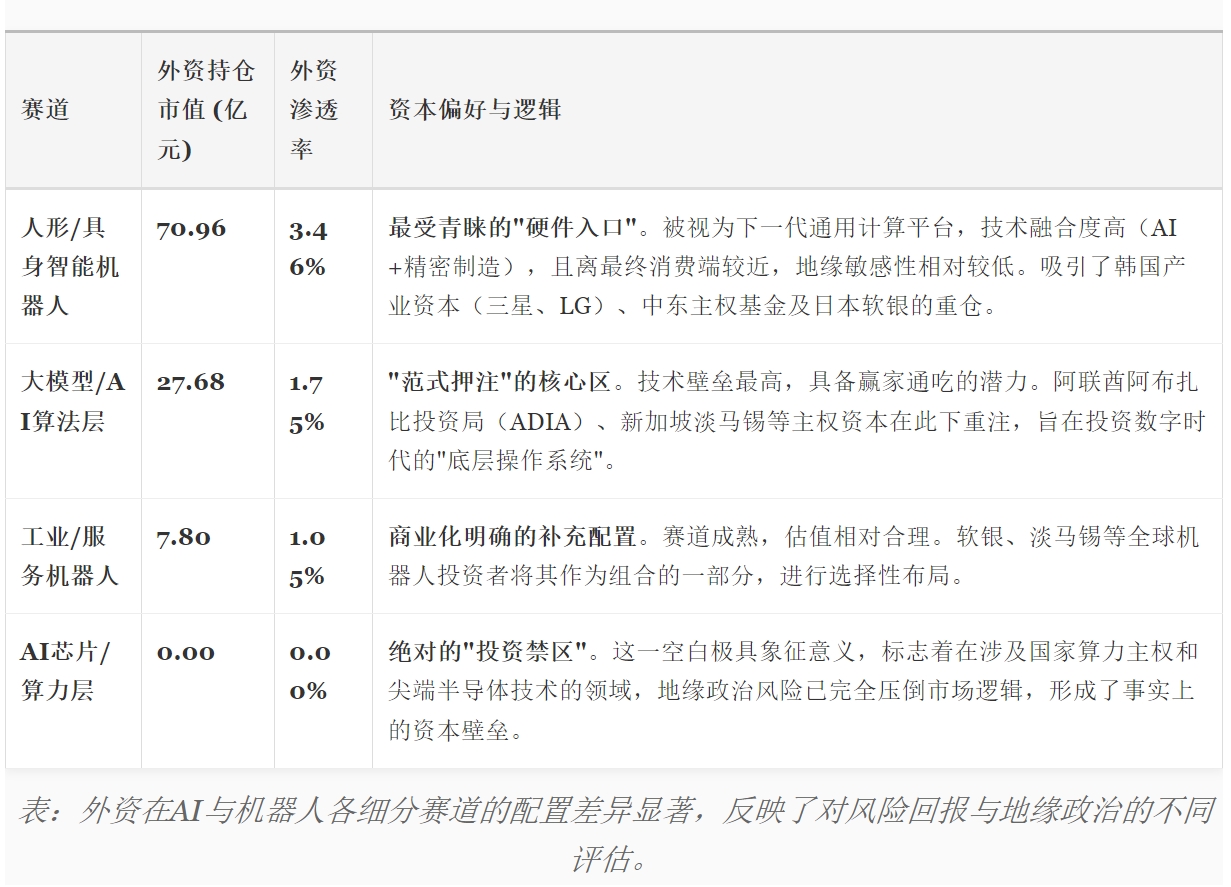 资本的流向是产业趋势最真实的投票。分析显示,外资在不同赛道的配置差异,精准反映了其对技术成熟度、商业化前景及政治风险的判断。
